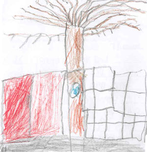The tree is brown. Snow is around the tree. My school is next to the tree. There is a hole in the tree.