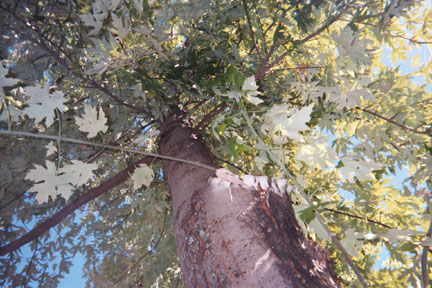| Our Tree in Autumn Roll your mouse over the image to see our class around the tree. Our tree is a Silver Queen Maple tree. It is very tall. The leaves are turning colors; red, yellow, orange. Some are still green and some are brown. There are knots in the bark and it is very branchy. The bark is very bumpy and has lots of texture. It is in the middle of the garden in a clearing outside of our classroom. There are birds, butterflies and bees in our tree, and it shades our room in the afternoon.