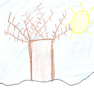 tree has no leaves and it is bare. There was snow on the ground and